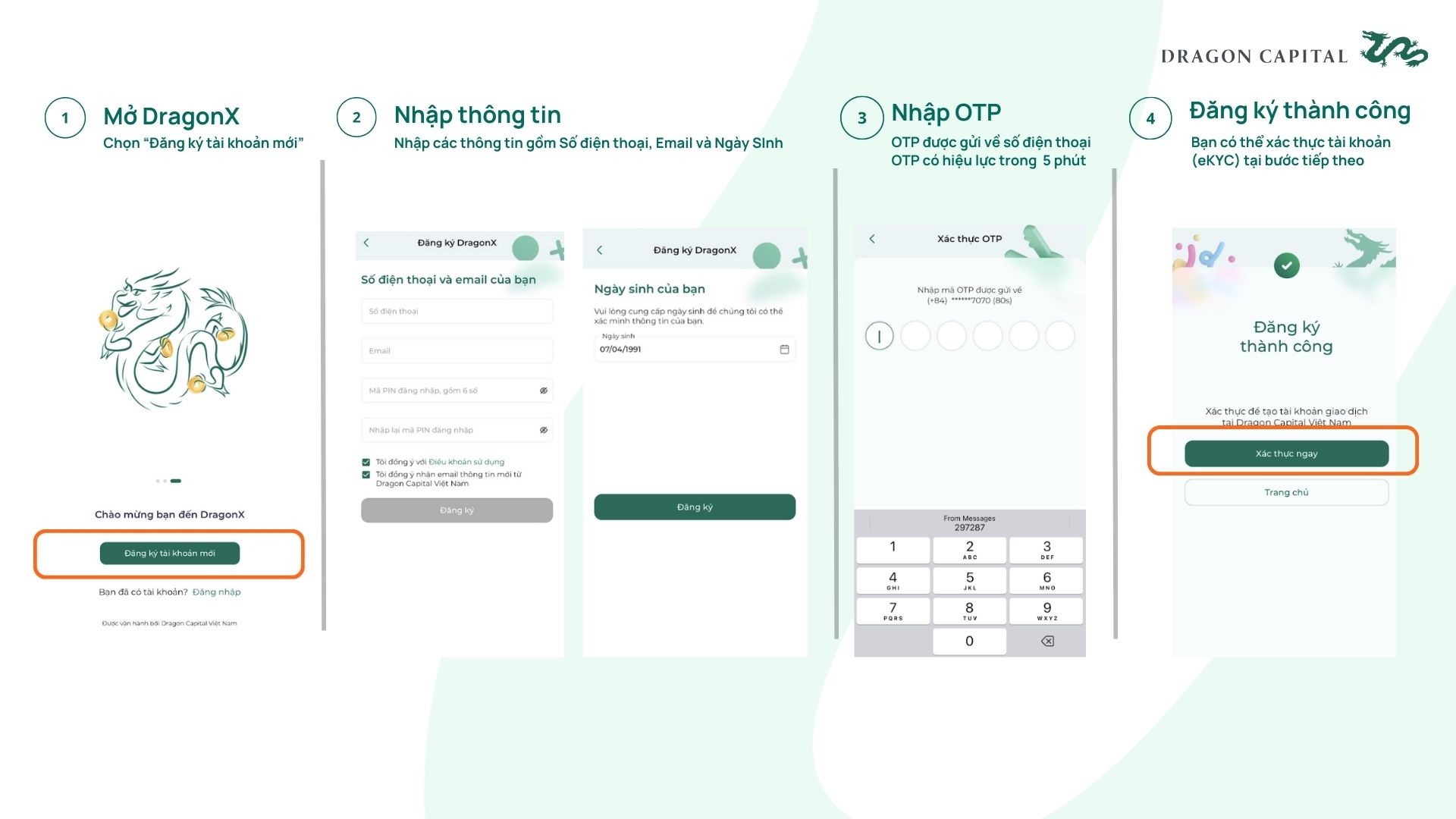 Dưới đây là quy trình 5 bước thực hiện trên ứng dụng DragonX by Dragon Capital (ứng dụng chính thức của Dragon Capital).