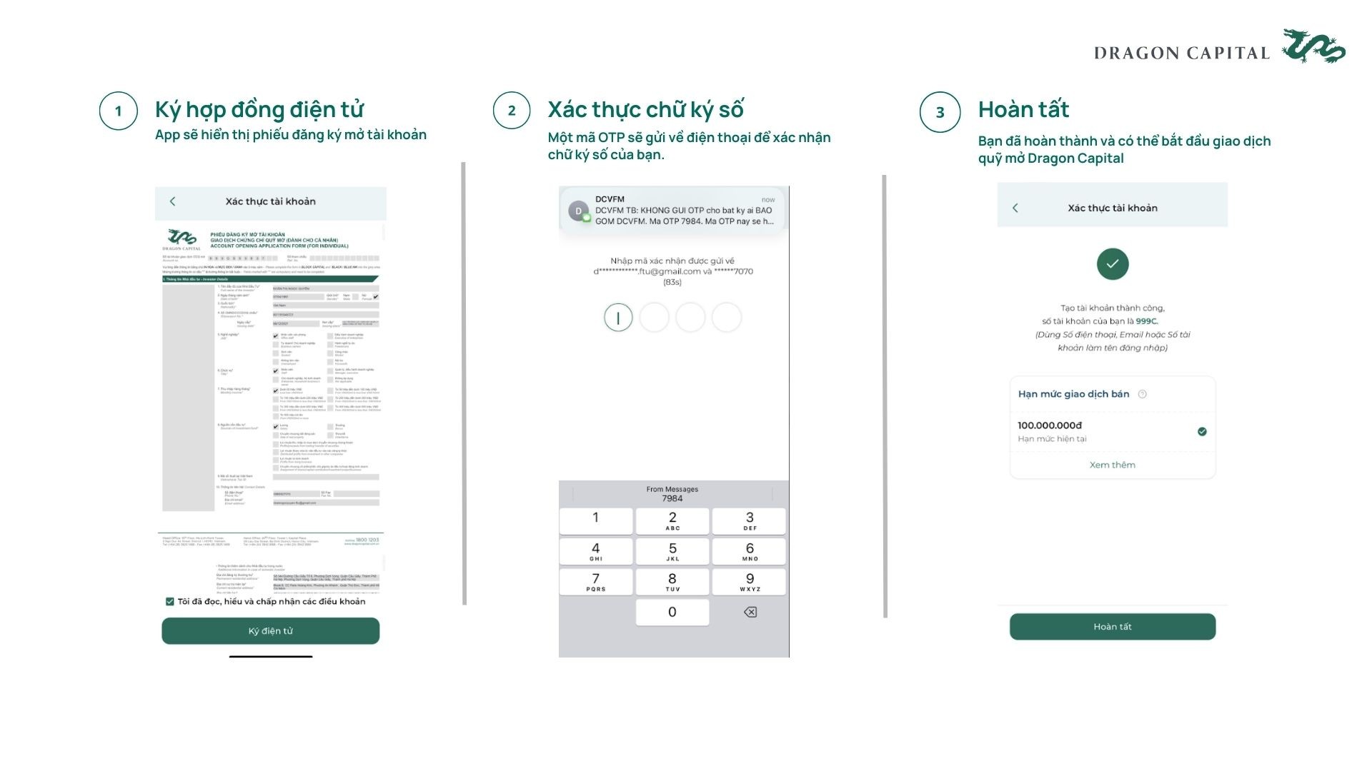 Sau khi ký hợp đồng điện tử, bạn đã chính thức hoàn thành quy trình mở tài khoản và có thể bắt đầu giao dịch các quỹ mở Dragon Capital