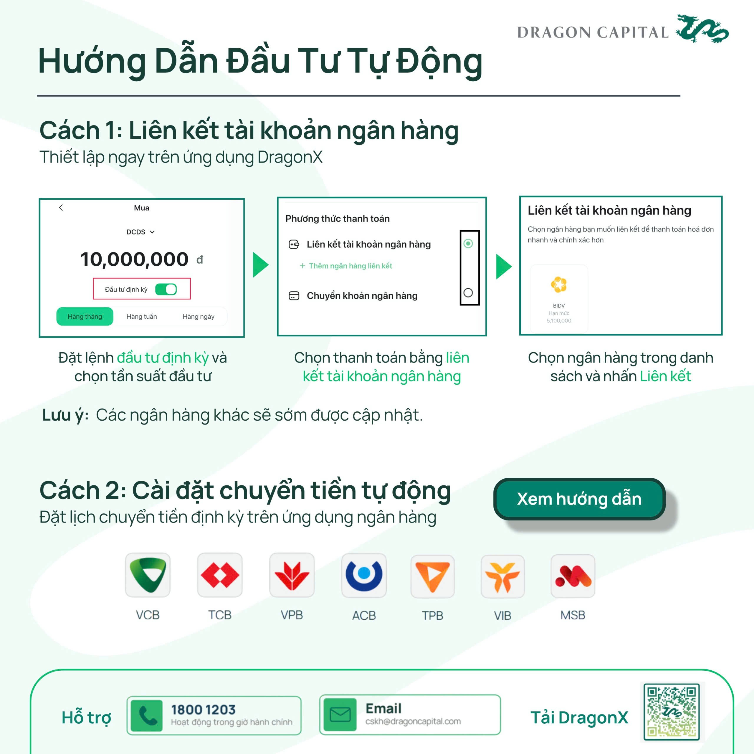 Trên ứng dụng DragonX của Dragon Capital, nhà đầu tư có thể thiết lập đầu tư tự động vào các quỹ mở như DCDS, DCDE, DCBF, DCIP chỉ trong vài phút.
