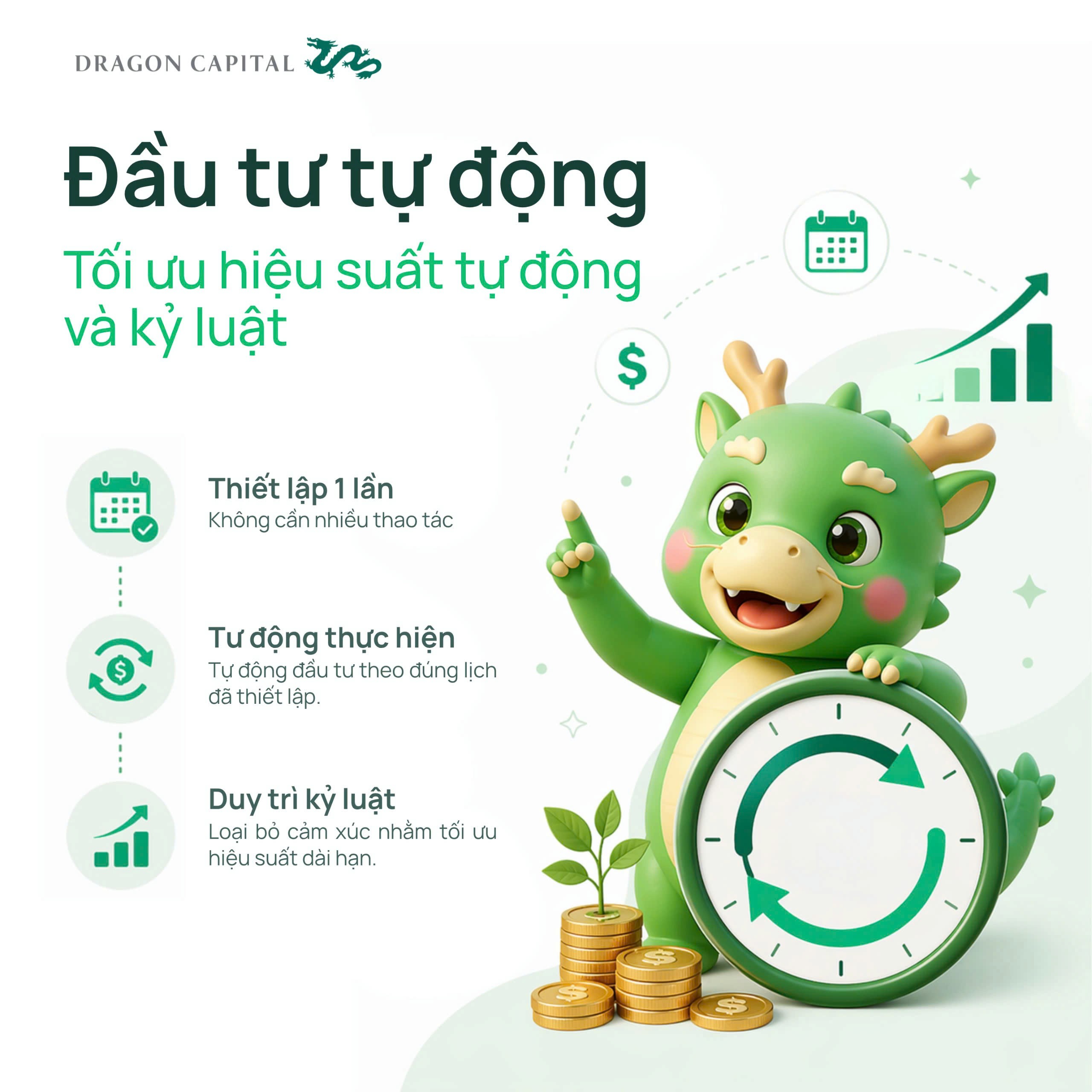 Đầu tư tự động là phương pháp đầu tư mà nhà đầu tư thiết lập một lệnh mua chứng chỉ quỹ với số tiền cố định và tần suất cố định (hàng ngày, hàng tuần hoặc hàng tháng). Sau khi thiết lập 1 lần, hệ thống sẽ tự động thực hiện lệnh mua theo đúng lịch đã cài đặt, giúp nhà đầu tư duy trì kỷ luật và loại bỏ yếu tố cảm xúc khi ra quyết định.