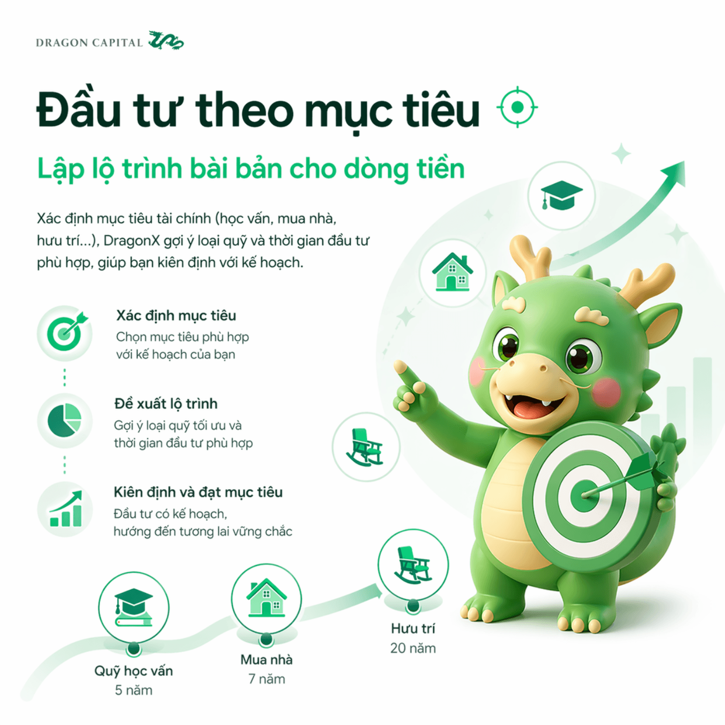 Đầu tư theo mục tiêu: Goal-Based Investing (GBI) là chiến lược chuyển trọng tâm từ "tối ưu hóa lợi suất thị trường" sang "tối ưu hóa kỳ vọng cuộc sống". Thay vì hỏi "Tôi nên mua quỹ nào để lãi cao nhất năm nay?", Dragon Capita giúp bạn định hình câu hỏi: "Tôi cần bao nhiêu tiền, vào năm nào, cho việc gì?"