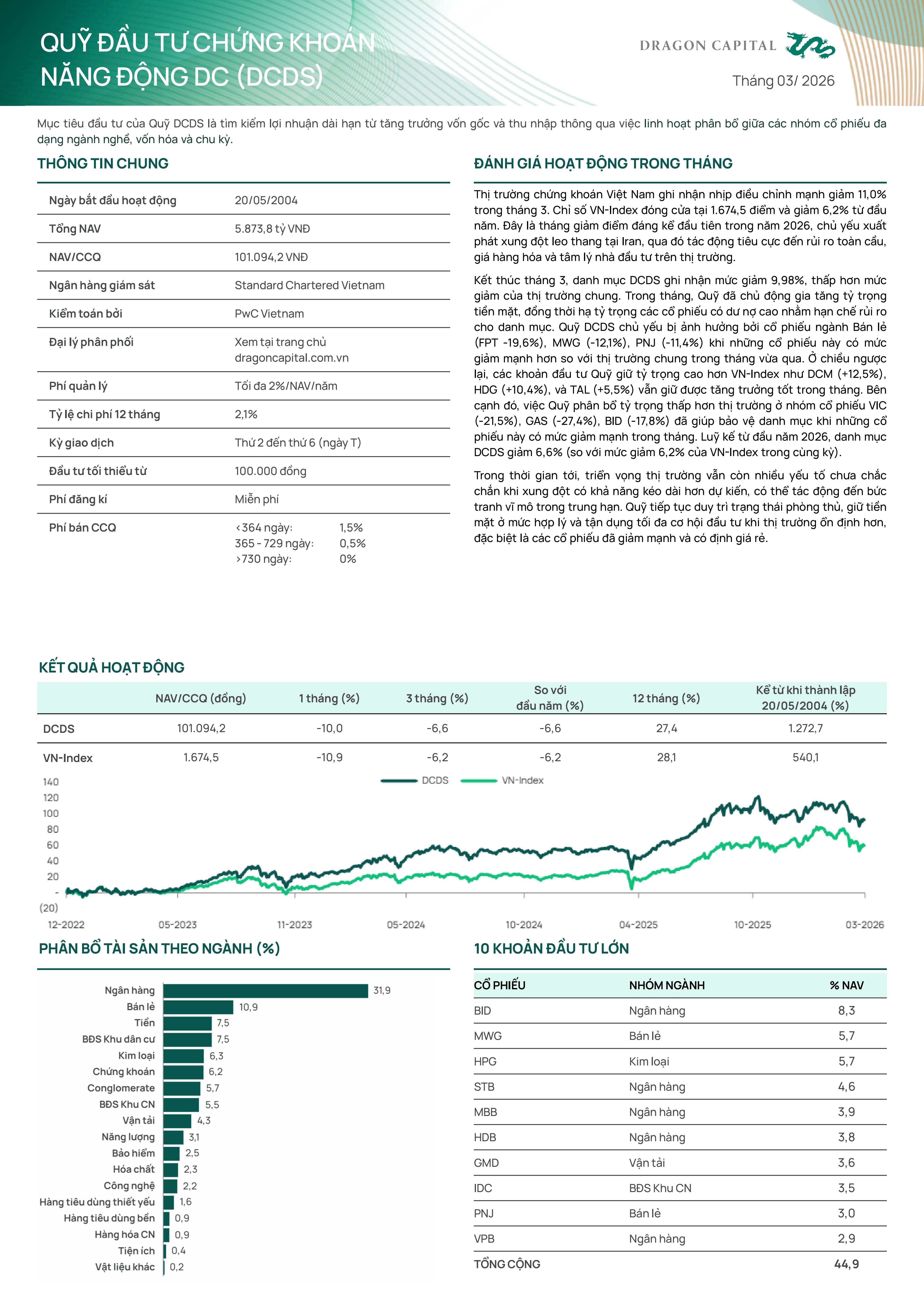 Kết thúc tháng 3, danh mục DCDS ghi nhận mức giảm 9,98%, thấp hơn mức giảm của thị trường chung. Trong tháng, Quỹ đã chủ động gia tăng tỷ trọng tiến mặt, đồng thời hạ tỷ trọng các cổ phiếu có dư nợ cao nhằm hạn chế rủi ro cho danh mục.Quỹ DCDS chủ yếu bị ảnh hưởng bởi cổ phiếu ngành Bán lẻ (FPT -19,6%), MWG (-12.1%), PNJ (-11,4%) khi những cổ phiếu này có mức giảm mạnh hơn so với thị trường chung trong tháng vừa qua.Ở chiều ngược lại, các khoản đầu tư Quỹ giữ tỷ trọng cao hơn VN-Index như DCM (+12,5%), HDG (+10,4%), và TAL (+5,5%) vẫn giữ được tăng trưởng tốt trong tháng. Bên cạnh đó, việc Quỹ phân bổ tỷ trọng thấp hơn thị trường ở nhóm cổ phiếu VIC (-21,5%), GAS (-27,4%), BID (-17,8%) đã giúp bảo vệ danh mục khi những cổ phiếu này có mức giảm mạnh trong tháng. Luỹ kế từ đầu năm 2026, danh mục DCDS giảm 6,6% (so với mức giảm 6,2% của VN-Index trong cùng kỳ).