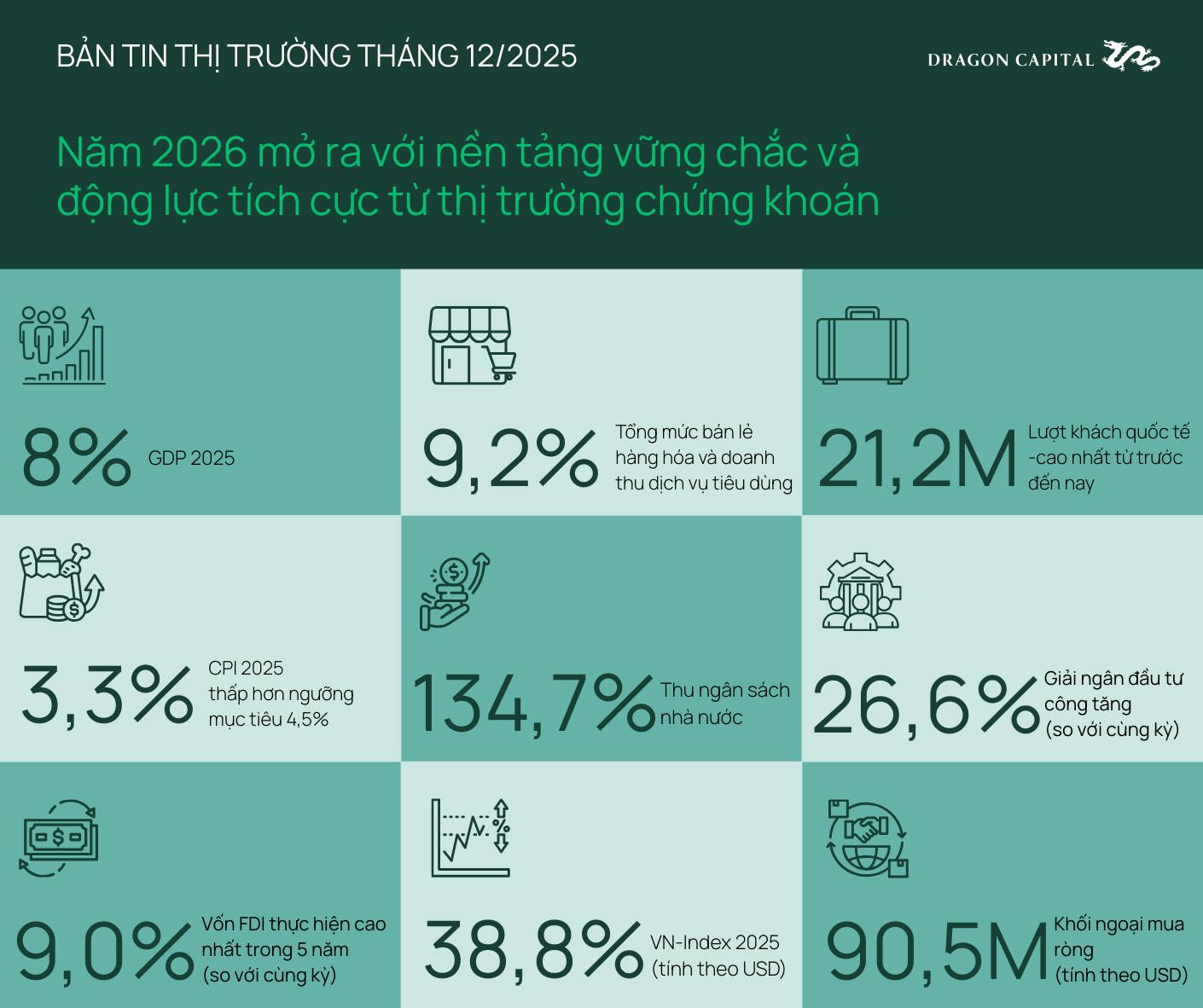 Việt Nam khép lại năm 2025 với sự tăng tốc rõ nét từ các hoạt động kinh tế. GDP cả năm đạt 8,0%, mức cao thứ hai kể từ năm 2011; đà tăng trưởng được củng cố mạnh mẽ vào cuối năm khi GDP quý 4 đạt 8,5% – mức cao nhất của quý 4 trong vòng 15 năm qua. GDP tính tại thời điểm báo cáo đạt 514 tỷ USD, tăng 38 tỷ USD so với năm 2024, từ đó nâng thu nhập bình quân đầu người vượt mốc 5.000 USD.