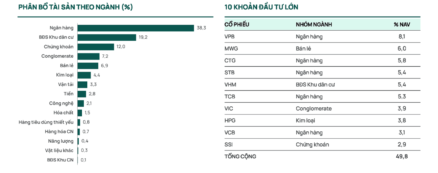 Trong chiến lược đầu tư linh hoạt, DCDS vào cuối tháng 6/2025 đã giảm tỷ trọng cổ phiếu VIC và VHM, đồng thời giải ngân cho nhóm ngân hàng với các cổ phiếu TCB, STB, MBB, và CTG. Tỷ trọng các cổ phiếu ngân hàng nói chung của DCDS tăng từ 28,28% cuối tháng 5/2025 lên 31,73% vào cuối tháng 6/2025.