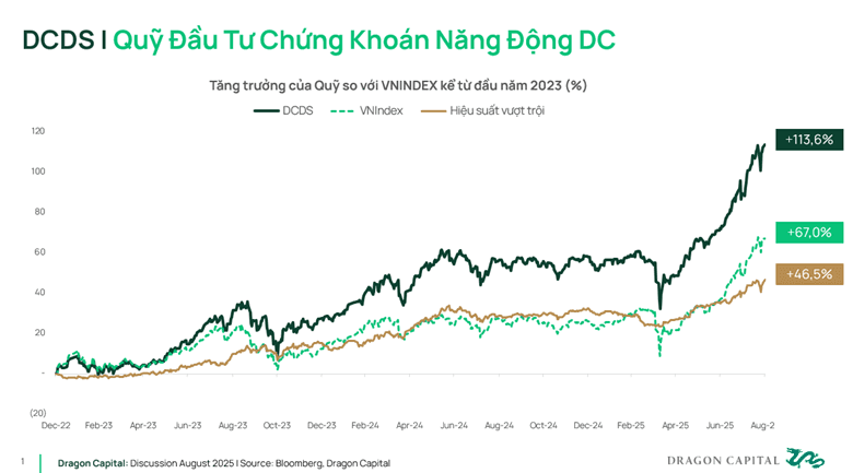 Trong bối cảnh đó, DCDS (Quỹ Đầu Tư Chứng Khoán Năng Động DC) gây ấn tượng khi là một trong những quỹ có hiệu suất vượt trội VN-Index. Theo dữ liệu tại kỳ định giá ngày 15/9/2025, tổng tài sản quản lý của DCDS đạt hơn 4.200 tỷ đồng, giá chứng chỉ quỹ đạt 109.435,73 đồng/đơn vị, tương đương tăng 34,38% so với thời điểm đầu năm.